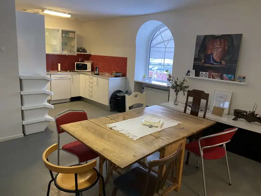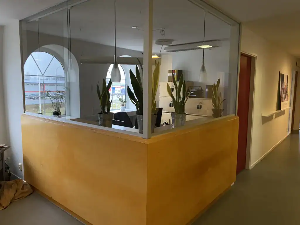Lokalen har ett fint ljusinsläpp genom stora fönsterpartier och charmiga välvda fönster som skapar en ljus och luftig känsla. Här finns både större mötesrum, en trevlig lounge-/visningsyta samt ett fullt utrustat kök/pentry som passar utmärkt för personalens pauser och interna möten.